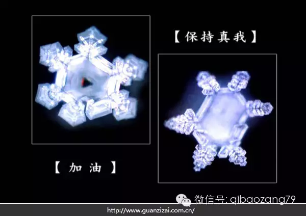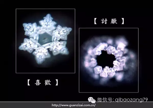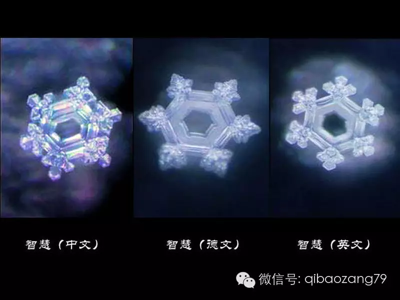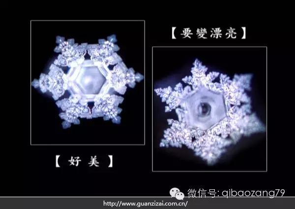 听到“爱”与“感谢”,水结晶呈现完整美丽的六角形;被骂作”浑蛋”,水几乎不能形成结晶;听过古典音乐,水结晶风姿各异;听过重金属音乐,水结晶则歪曲散乱……