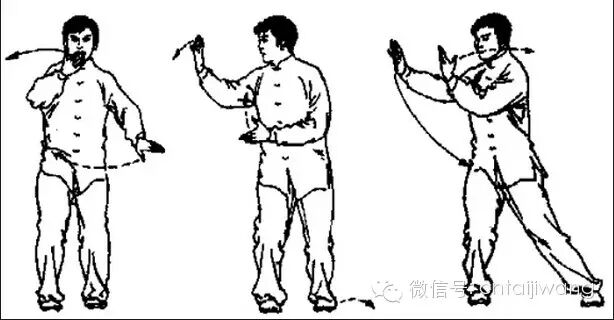 例如:正云手的第一动“收肘缠手”,对方双手挤按我右腕、肘处,我松沉右肩肘,同时向里收肘,右掌指向右外下侧划弧,即肘与手的收中放的动势在同一时问完成。掌指部的缠转是梢节的紧放,肘部的收转是中节的随化,对方立即处于“落空”和“即…”的两难境地,非高手则即刻出局。