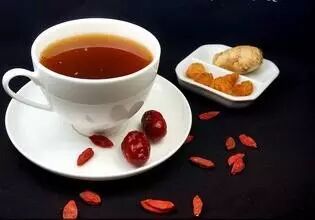 姜枣茶(2杯)原料:红枣6颗、枸杞一把、花椒十几颗、生姜4片(寒气大的可加量)做法:加适量水,煮成淡红色即可。
