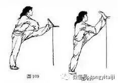 1.正压:身体正面对支撑物,一腿支撑,另一腿前平举,脚跟放在肋木或其它支撑物上,脚尖勾起,膝部挺直,两手按于膝部或抱住脚尖,上身反复前俯振压(图109),力量和幅度逐渐加大,使下颊尽量触及脚尖。左右腿轮换练习。如果腿部高举,脚放在较高支撑物上,称高压腿(图110)。脚放于地面时,称低压腿(图111)。高压、低压的方法和要领皆与前相同。